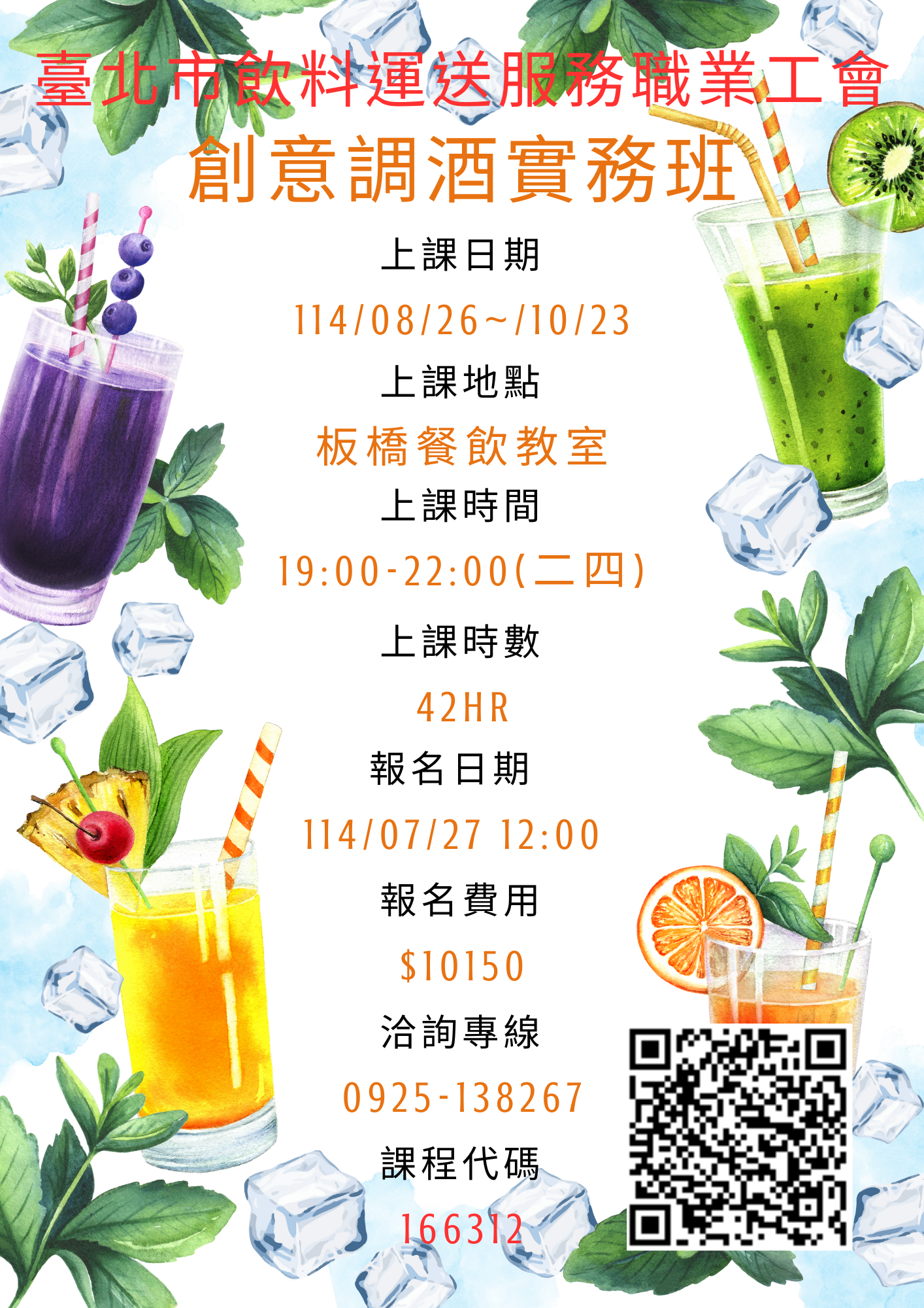 創意調酒菜單研發與設計/小試身手-總驗收/ 上課成果與自己的創意結合製作出一杯具有好喝具有商業價值的創意調酒 |