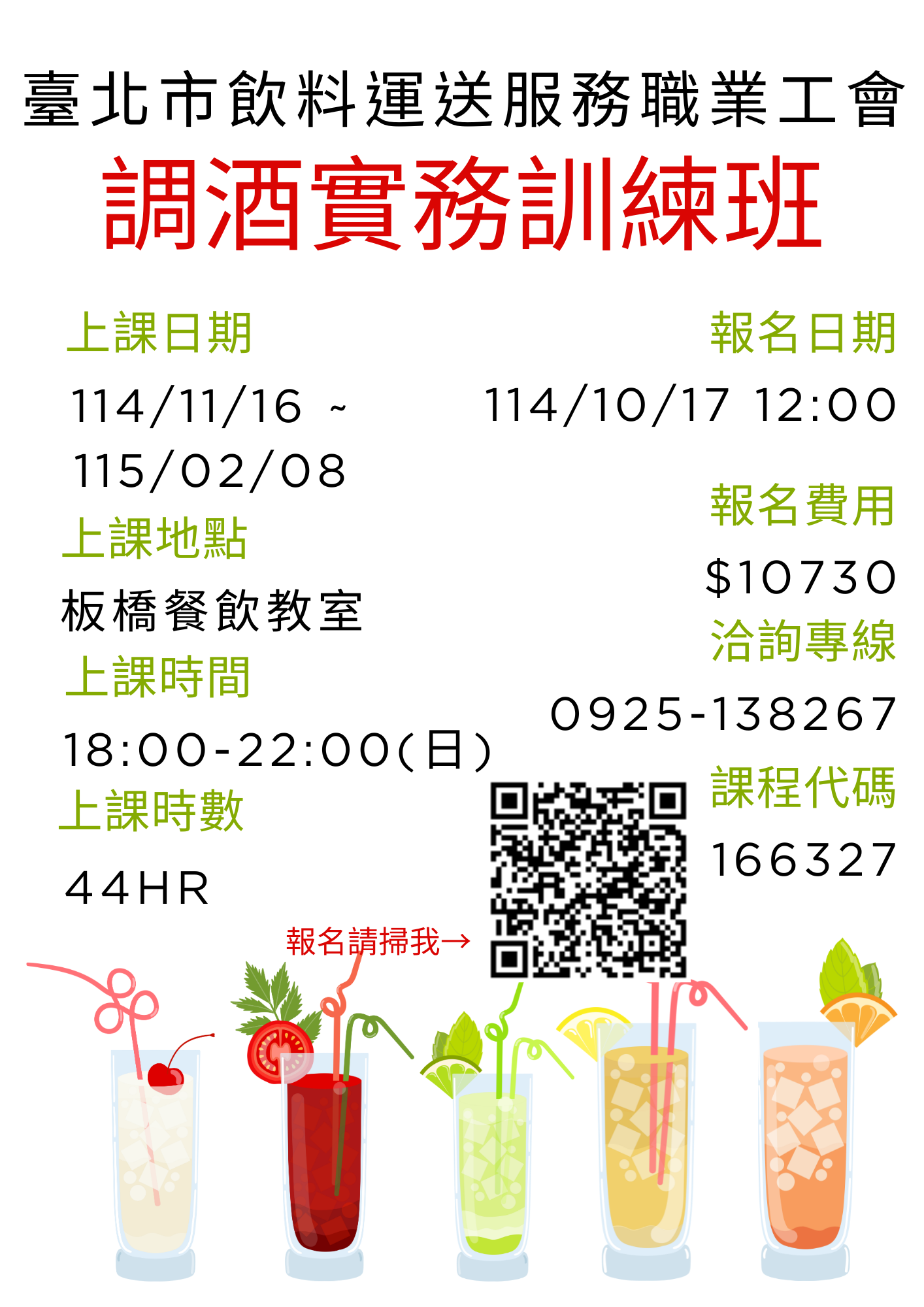 課程介紹/使用操作安全說明及設施設備介紹及器具設備介紹(1小時)認識酒類與用具/ 1.杯型介紹-短飲 長飲 2.器具介紹-量酒器 酒嘴 3.食品安全衛生宣導(1小時) |