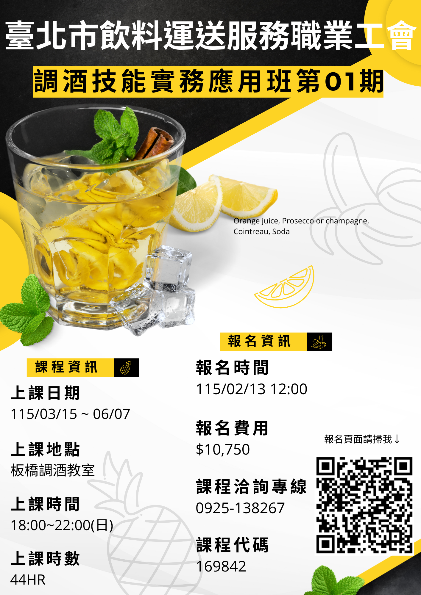 酒類飲品調製(1)/ 1.酒吧實務常用裝飾切割(酒吧常用裝飾切割 柑橘,蘋果)、夏日系列特調(自製鳳梨蘭姆酒,MOJITO)、分組實作練習 |